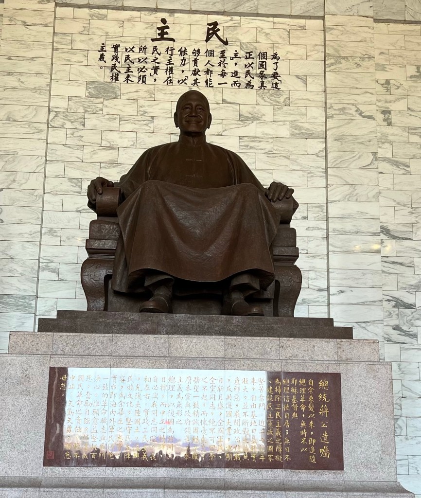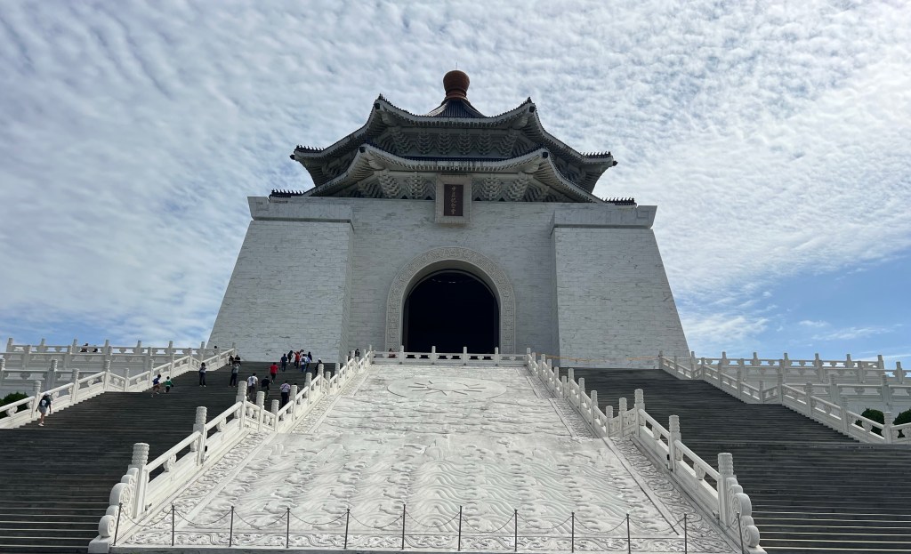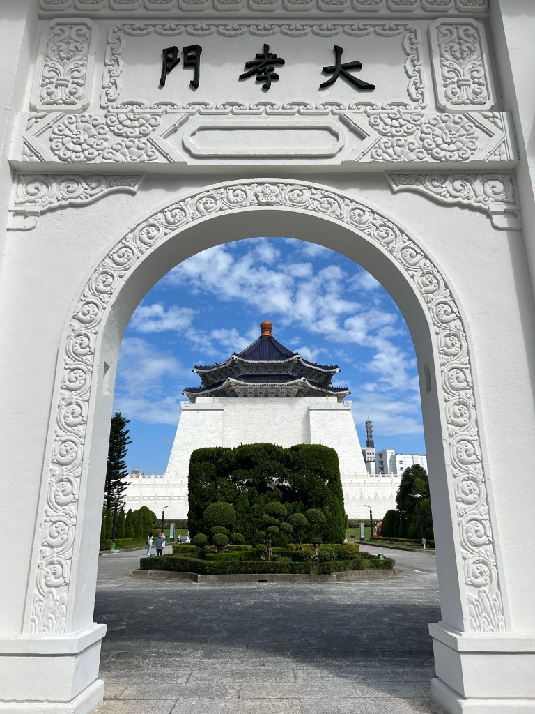 Uit Wikipedia: Het gebouw is rechthoekig met witte muren. Het dak is blauw en achthoekig; in Azië wordt het getal acht geassocieerd met overvloed en geluk. Het blauw en wit komen ook terug in de vlag van de Kwomintang en Taiwan. Twee witte trappen met elk 89 treden, gelijk aan de leeftijd die Chiang heeft bereikt, leiden naar de hoofdingang. Het gebouw heeft een oppervlakte van 15.000 m² en is zo’n 70 meter hoog. Op de begane grond bevinden zich een bibliotheek en een museum over het leven van Chiang Kai-shek en de geschiedenis van Taiwan. Op het bovenste niveau is een grote hal met daarin een groot standbeeld van Chiang. Het beeld staat met het gezicht gericht naar het westen, naar het vasteland van China.