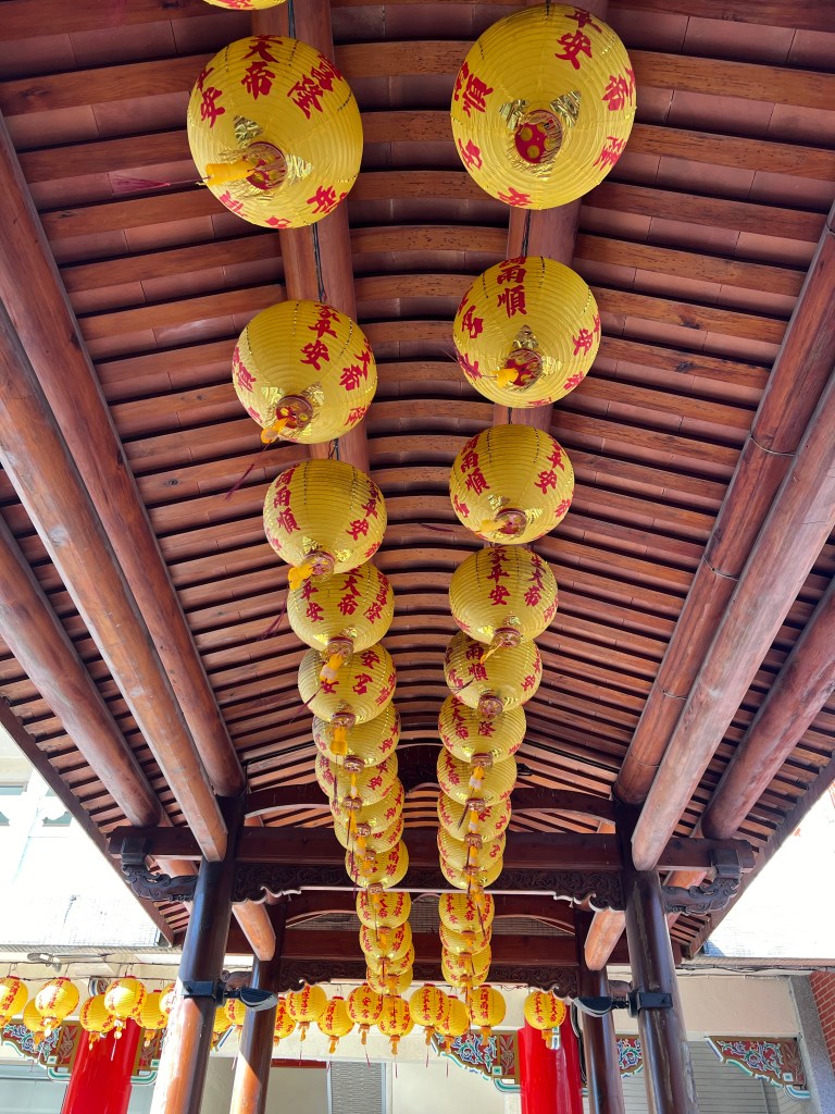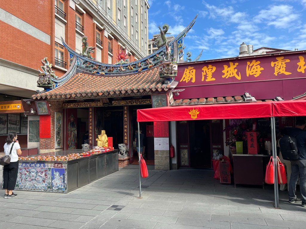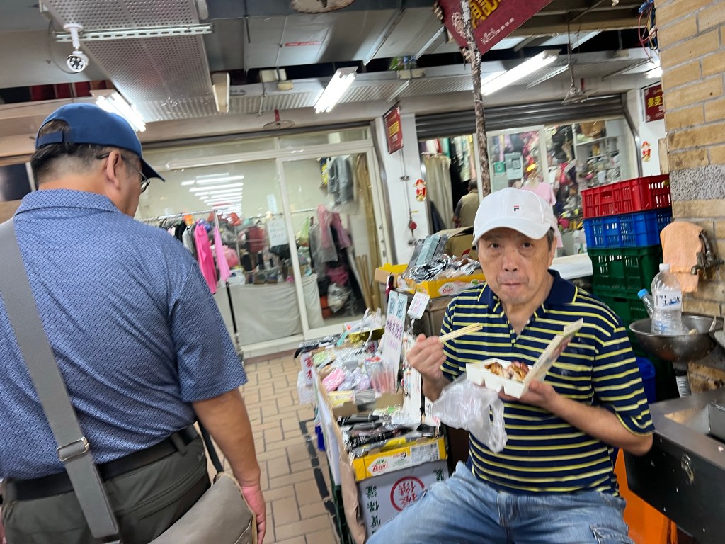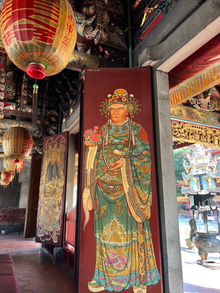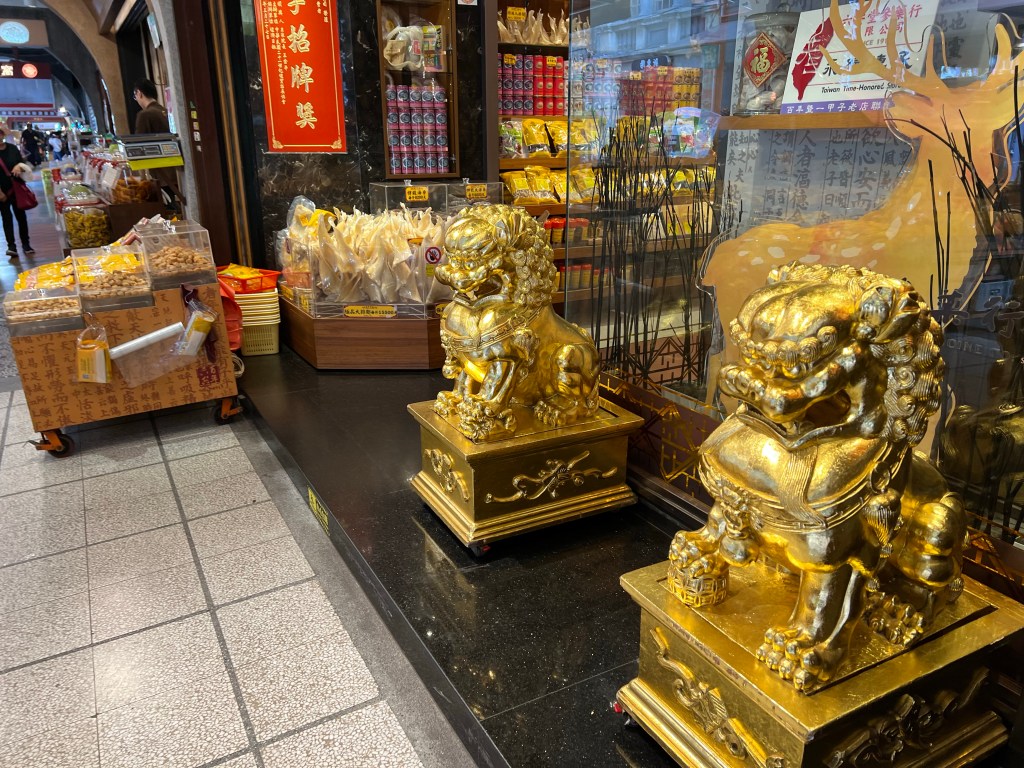 Om 11 uur begint de wisseling van de wacht dat hebben we nog net mee kunnen pikken. Dan parkeren we de auto in de parkeergarage en gaan we naar Dihua street. We lopen eerst langs allemaal fournituren zaken en zien hoe Taipei vroeger eruit zag. Allemaal winkeltjes en eettentjes. We lopen even over de markt en eten wat in de buurt. Wederom met Google translate snappen we wat we bestellen. Het is best lekker. Dan gaan we verder met Dalongdong Baoan tempel. Een uitbundige uitgevoerde tempel. We zien verschillende mensen gooien met blokjes. Jiaobei (houten blokjes of ook wel amaanblokjes genoemd) worden gebruikt om een antwoord te krijgen op een ja/nee vraag. Je stelt je vraag, gooit de twee blokjes in de lucht en afhankelijk van hoe ze vallen, krijg je een antwoord op je vraag. Eén mevrouw bleef maar door gooien. Volgens de gids iemand die heel veel vragen had.