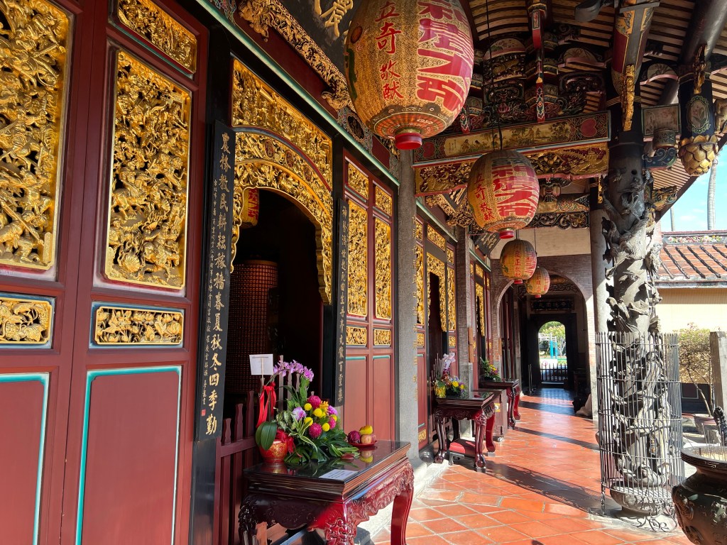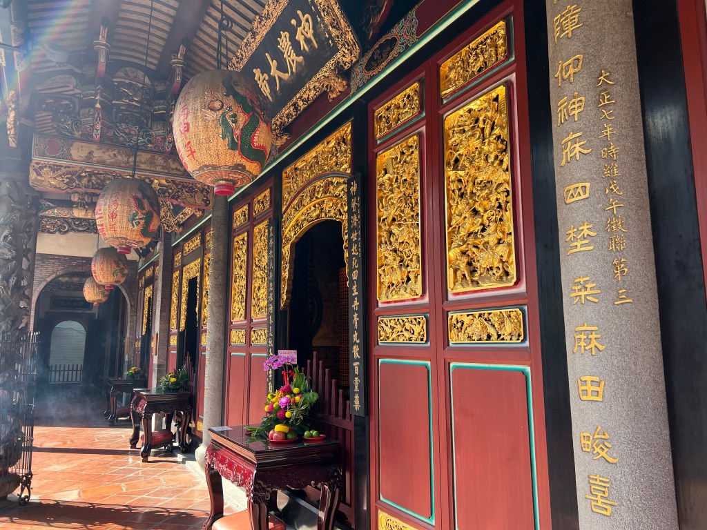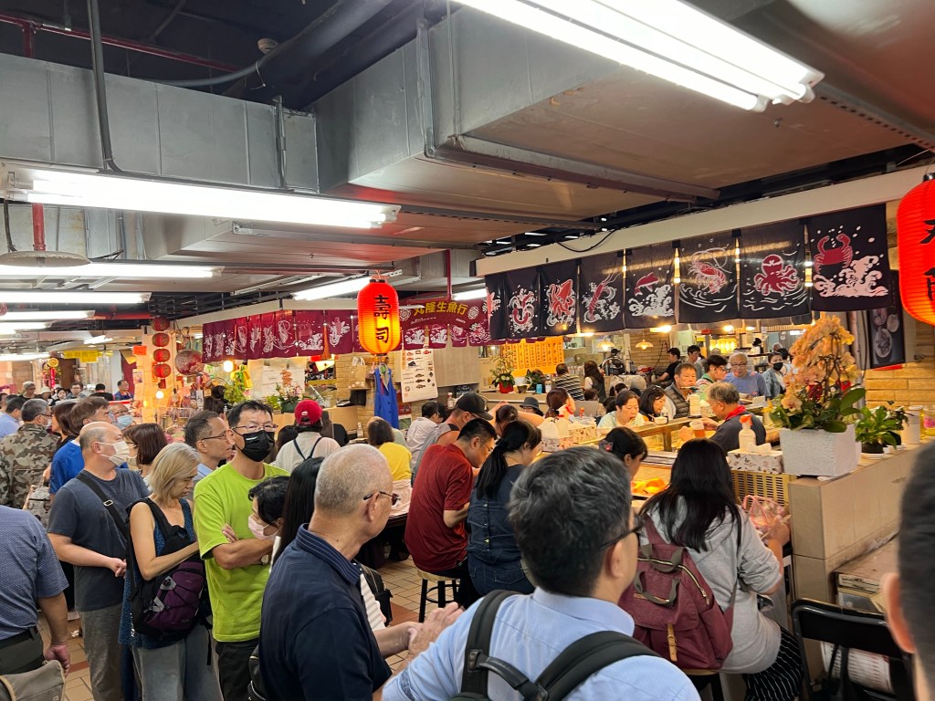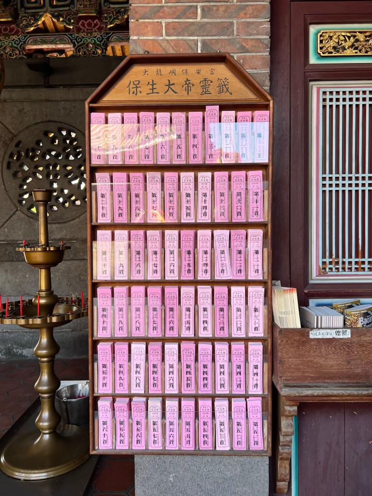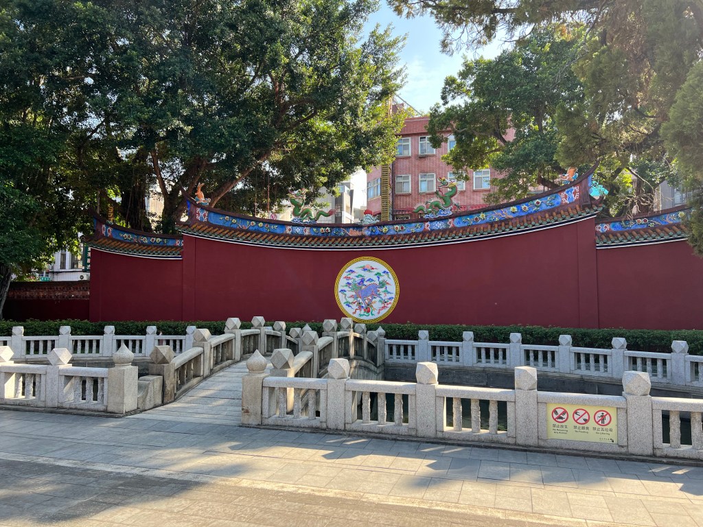 Om 11 uur begint de wisseling van de wacht dat hebben we nog net mee kunnen pikken. Dan parkeren we de auto in de parkeergarage en gaan we naar Dihua street. We lopen eerst langs allemaal fournituren zaken en zien hoe Taipei vroeger eruit zag. Allemaal winkeltjes en eettentjes. We lopen even over de markt en eten wat in de buurt. Wederom met Google translate snappen we wat we bestellen. Het is best lekker. Dan gaan we verder met Dalongdong Baoan tempel. Een uitbundige uitgevoerde tempel. We zien verschillende mensen gooien met blokjes. Jiaobei (houten blokjes of ook wel amaanblokjes genoemd) worden gebruikt om een antwoord te krijgen op een ja/nee vraag. Je stelt je vraag, gooit de twee blokjes in de lucht en afhankelijk van hoe ze vallen, krijg je een antwoord op je vraag. Eén mevrouw bleef maar door gooien. Volgens de gids iemand die heel veel vragen had.