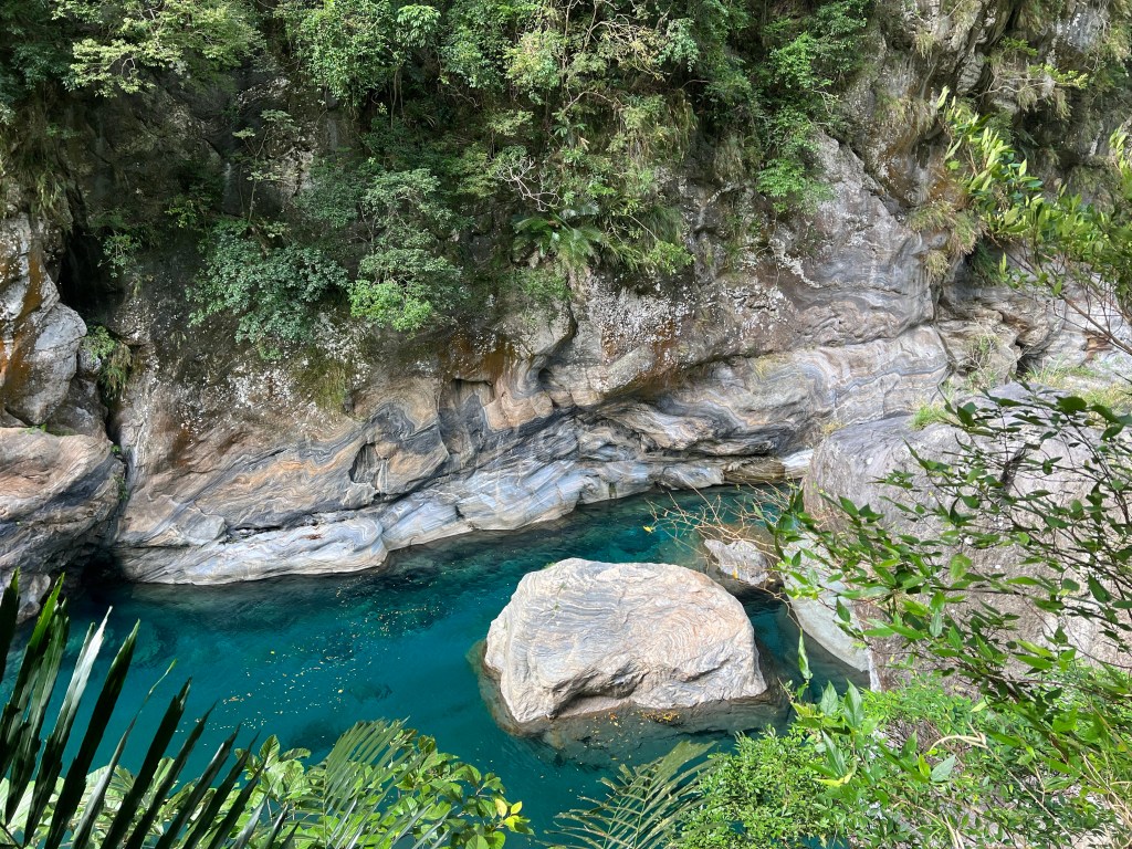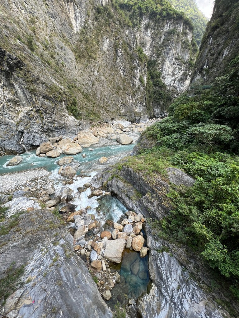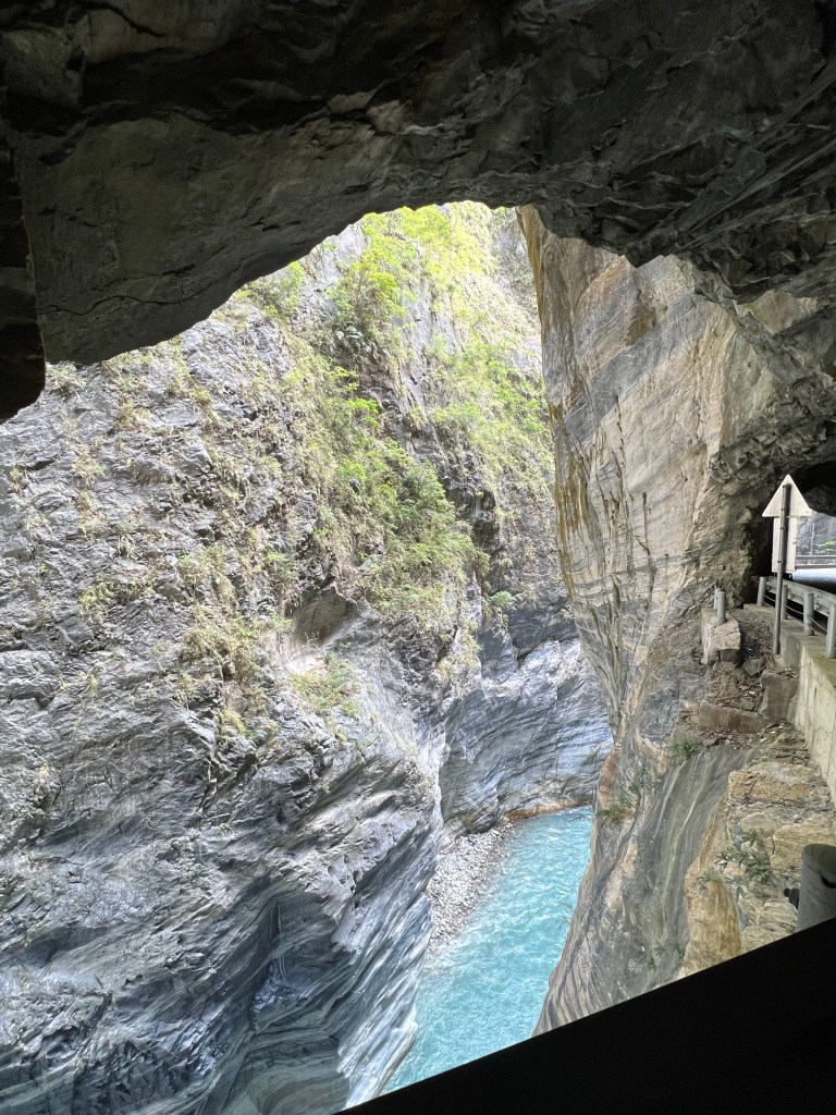 Tunnel of Nine Turns wordt beschouwd als het meest schilderachtige deel van de Taroko-kloof, die in 2019 na jaren van reparatiewerkzaamheden heropend werd voor het publiek. We lopen langs het pad loopt en zien de meanderende rivier van bovenaf lopen door de diepe en spectaculaire kloof. We zien de marmeren kliffen in diverse kleuren.