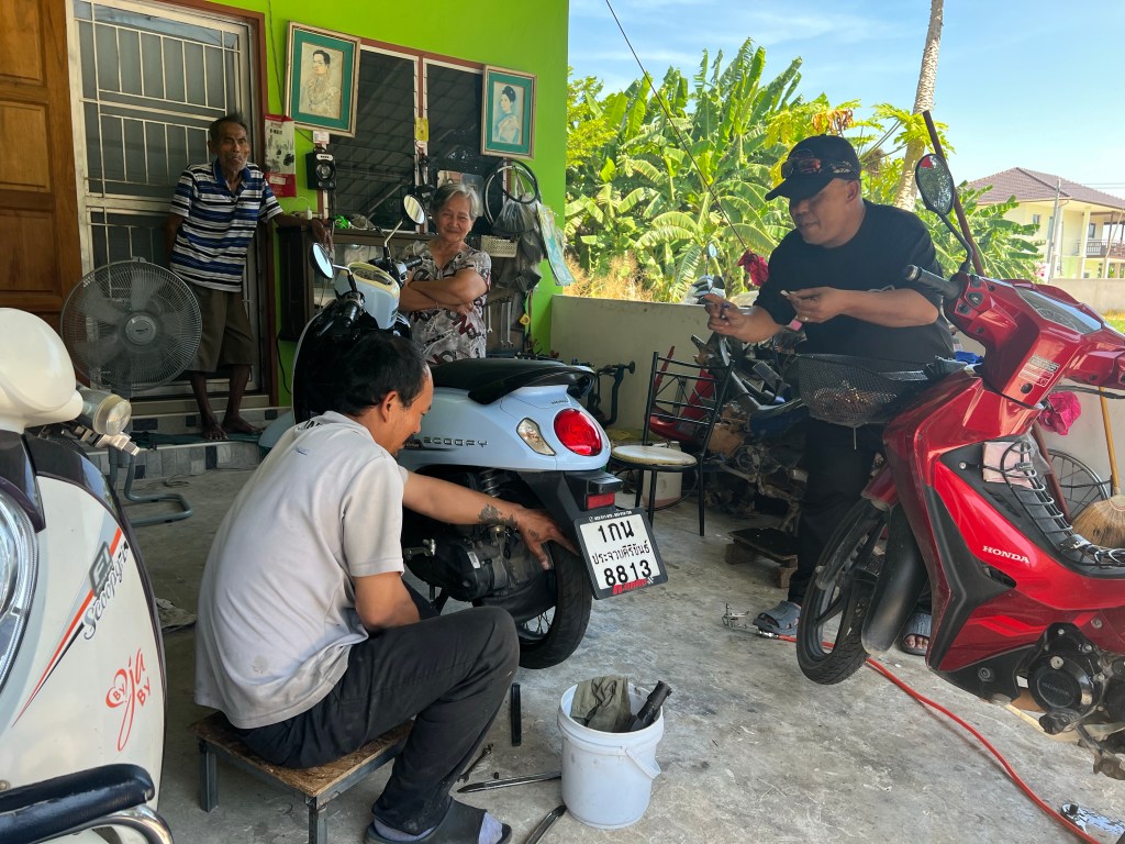Maar nee we worden bij een “garage” gebracht. Meisje gaat weg. Wij staan daar. Inmiddels komt er een vriend bij, die wat Engels spreekt. Wij weer bellen met de verhuurder en geven die aan de garagemeneer. Voor 140 bath wordt ie gerepareerd. Geen geld natuurlijk. De hele familie staat er inmiddels bij. Ik mag plaatsnemen op 1 van de stoeltjes. Het wordt nog helemaal gezellig. Binnen de kortste keren is de band gerepareerd. En kunnen we door.