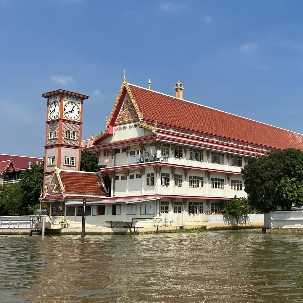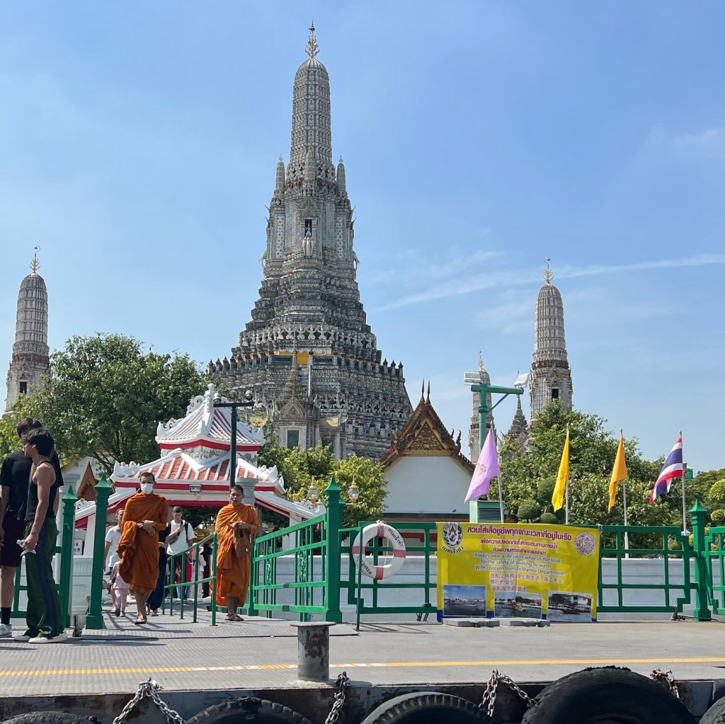 Dan nog een laatste dagje in Bangkok. Het is lekker warm dus we zoeken weer het water op. Nu gaan we met de oranje lijn. Voor 16 bath heb je een enkeltje. En scheuren maar langs de pieren. De boot zit vol. Maar hoe verder we komen hoe meer eraf gaan dan erbij komen. Dus halverwege hebben een plaatsje bemachtigd en genieten we van het uitzicht, het windje en de toer.