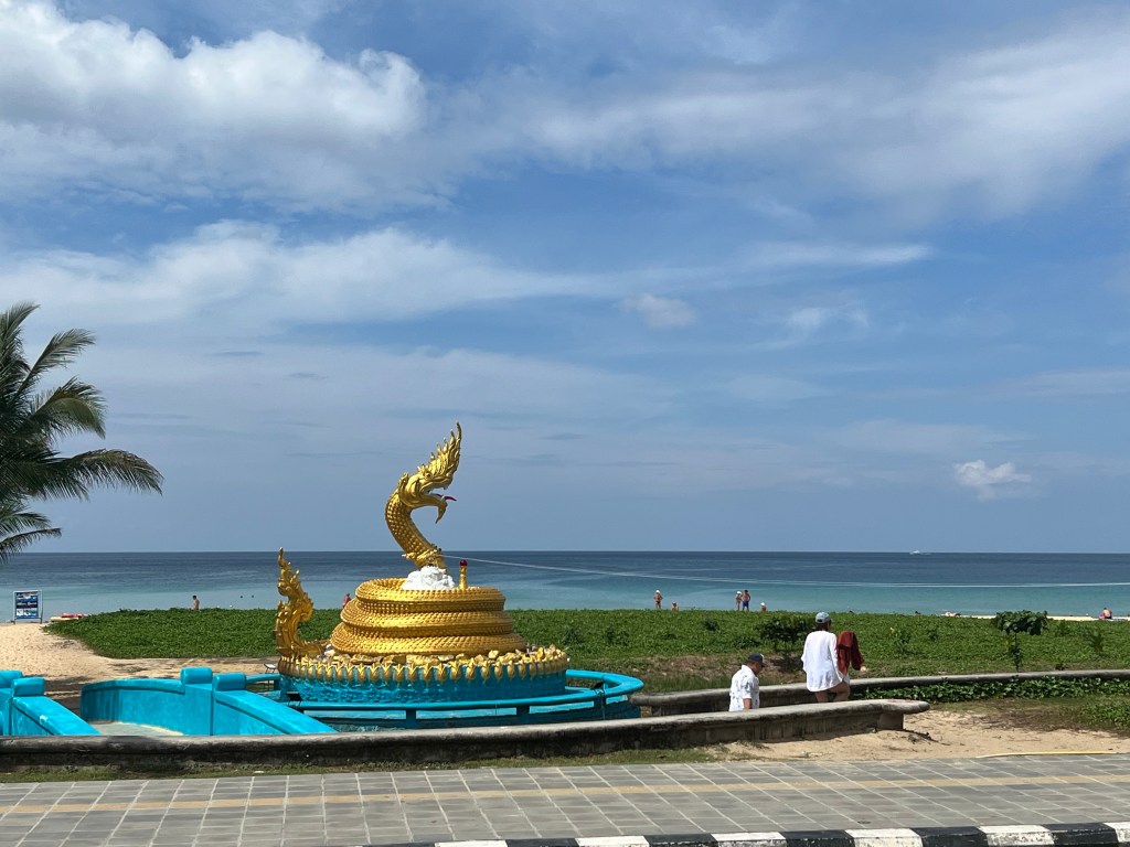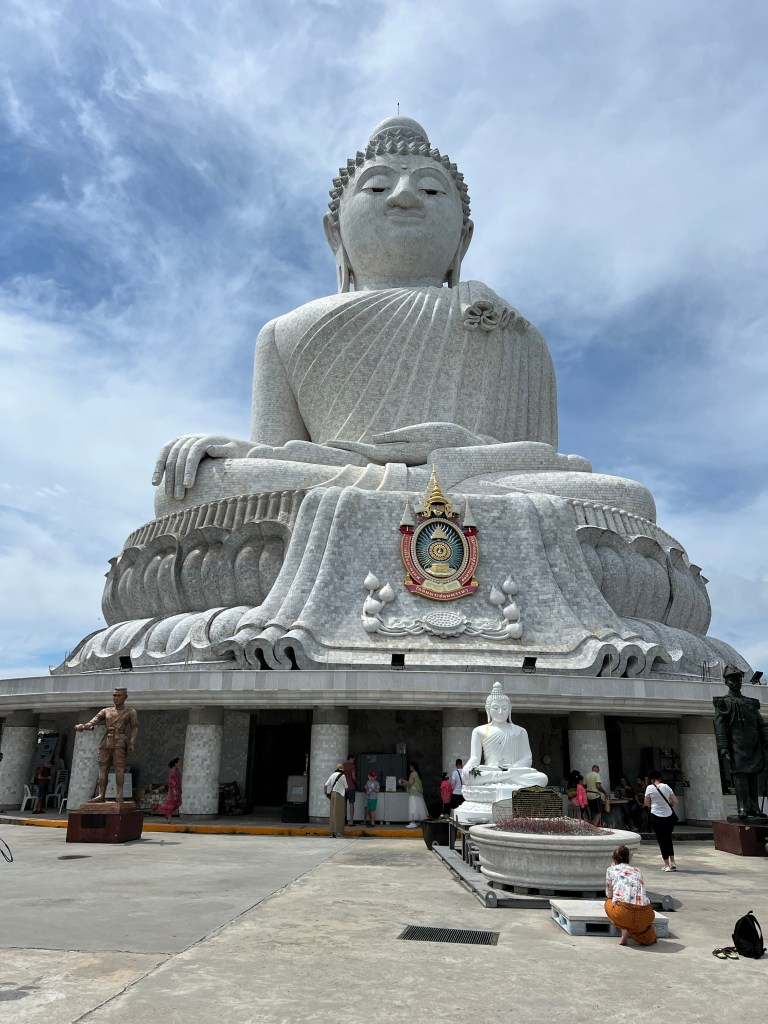 Deze dag gaan we naar de Big Buddha. We hebben site gevonden met toeristische routes op Phuket. En een van de routes leidt naar de Big Buddha. Dus oortje in. Telefoon in de houder en gaan. We hebben lekker weer. Zon en wolken. Op sommige plekken is het druk. De route leidt langs de kust. We stoppen al snel om van het uitzicht te genieten. Het is nu zelfs heel warm. Dan rijden we verder. Meer door de heuvels. Later komen we weer op een heel druk stuk. M’n oortje gilt dat ik links moet aanhouden met als gevolg dat we door een tunnel rijden waar je als scooter niet mag rijden. We voelen ons dan ook wat ongemakkelijk. Even het gaspedaal in en vlug hier weg wezen. Het laatste stuk is erg hobbelig. Van verschillende punten zagen we de Buddha al liggen. Mooi hoor.