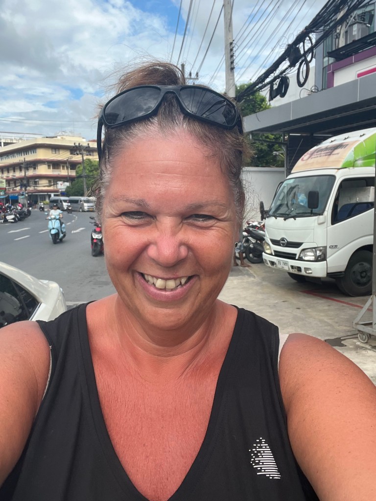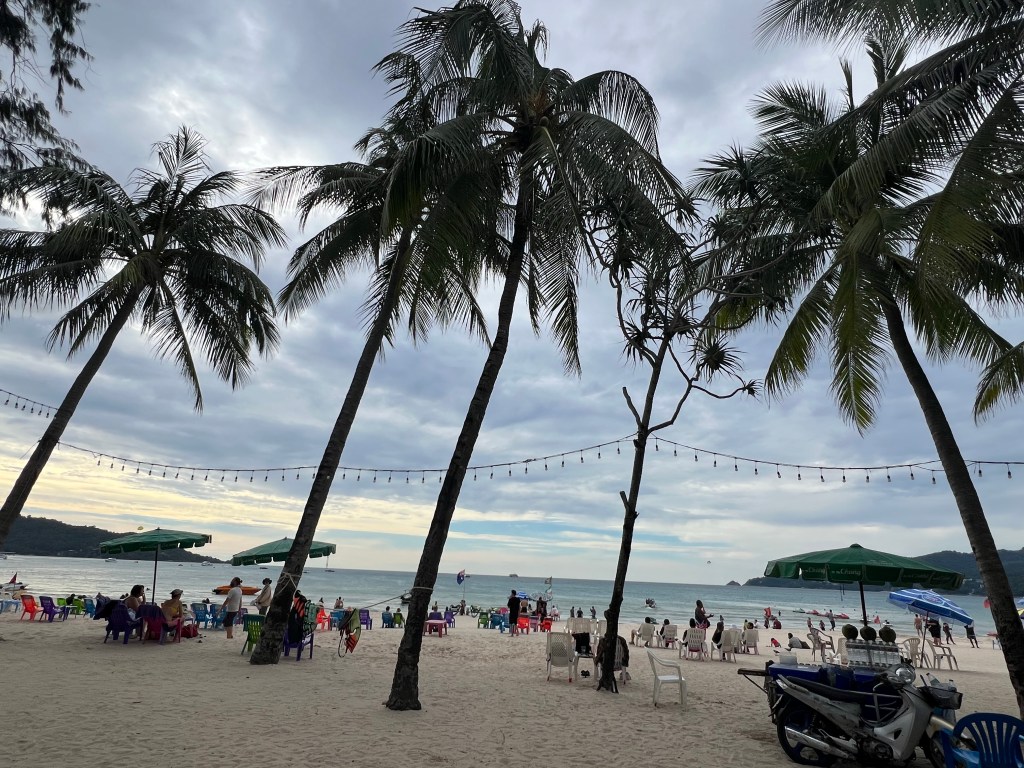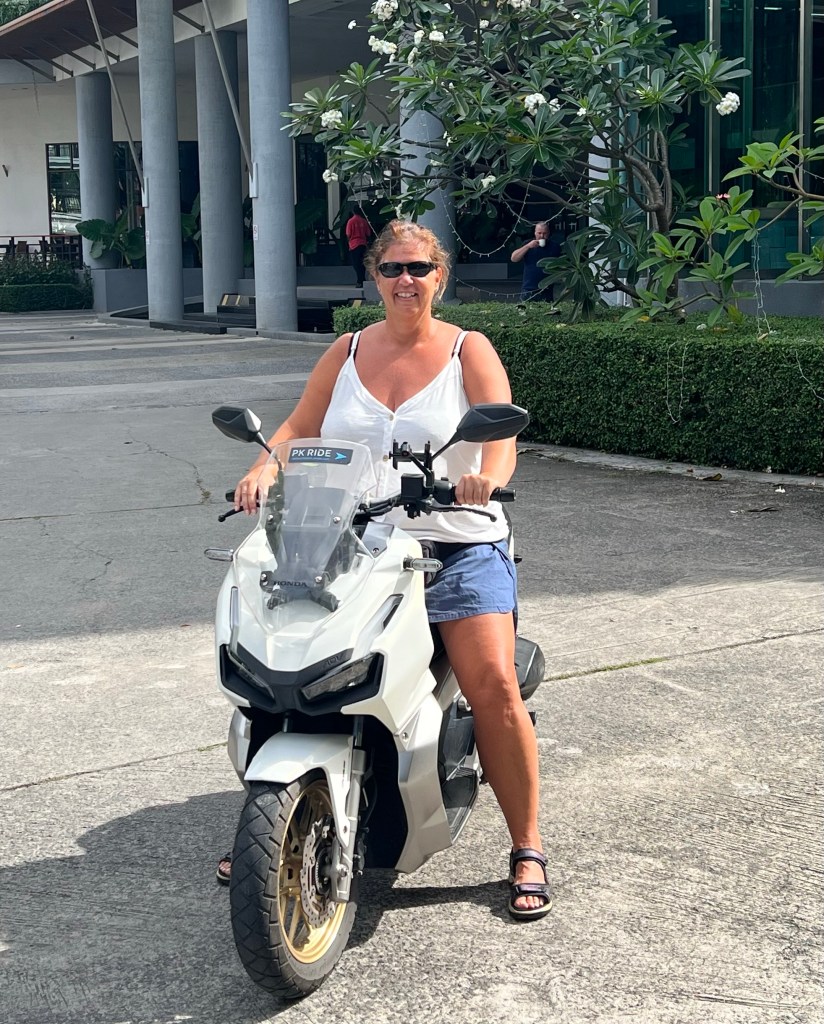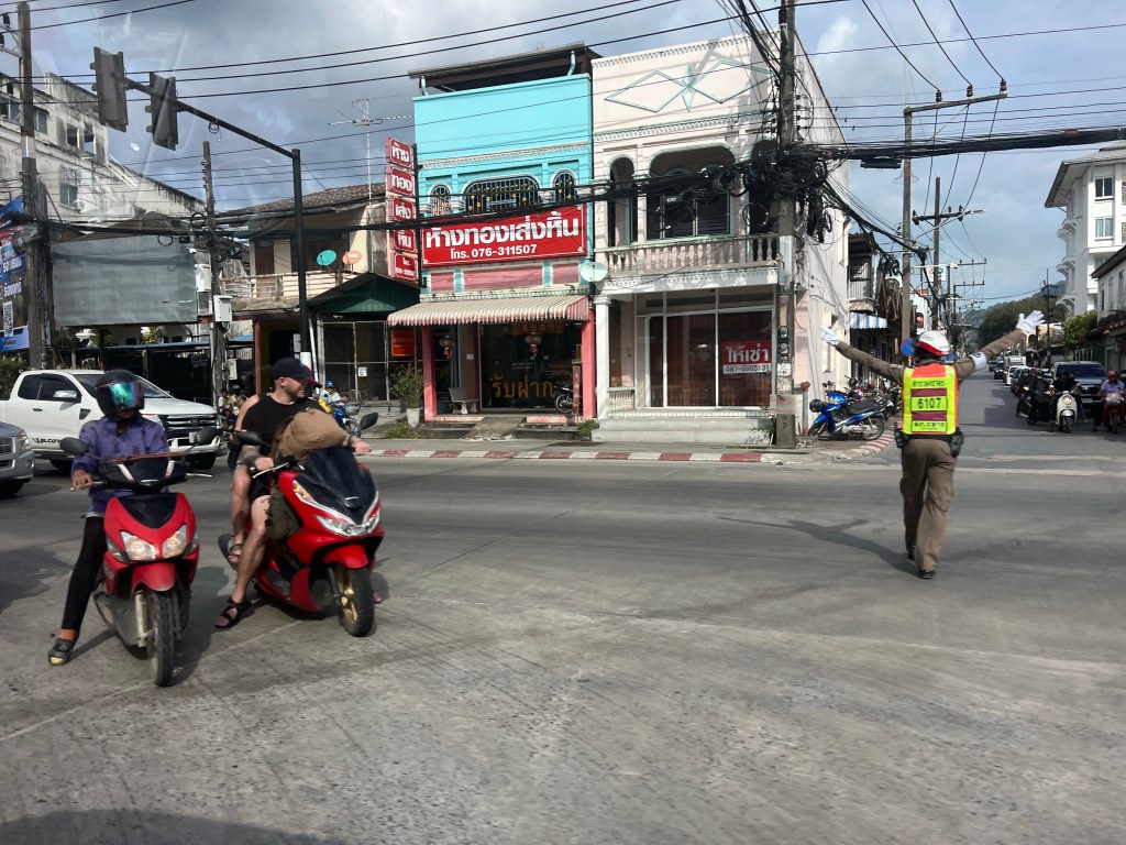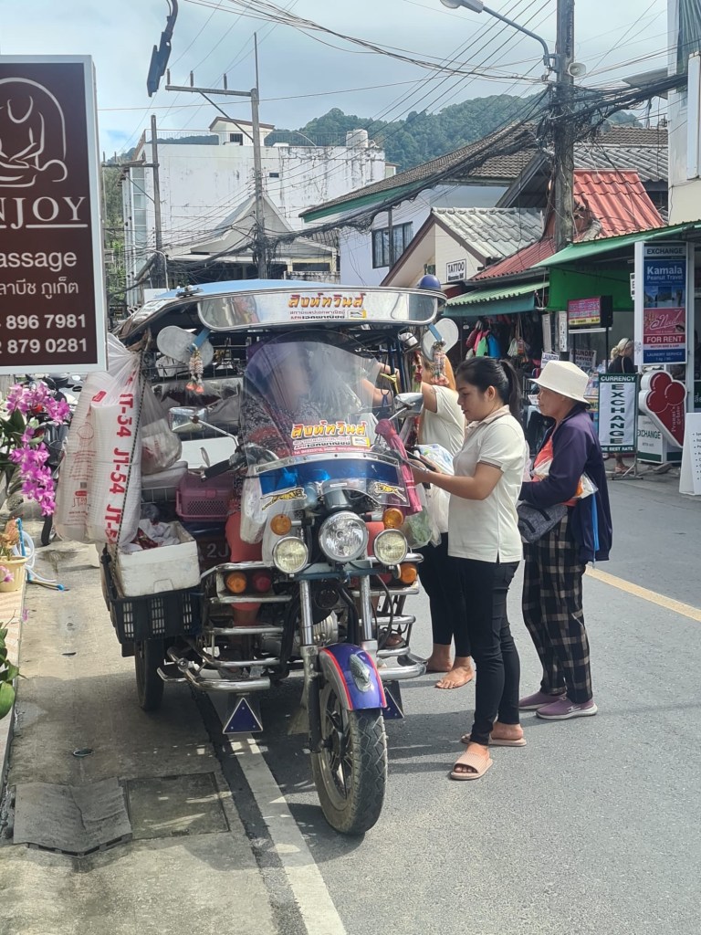 Genoten van de rit. Doel was Kamala beach. Dat vinden we een leuk plaatsje. Daar fijn aan de zee gezeten. Inmiddels had ik wat inkopen gedaan. Dat moest allemaal in de buddy sit. Lang verhaal kort. Motor van Rudy deed t niet meer. Volgens Rudy was de buddyseat Een heuvel opgelopen met de motor. Daar was een verhuurbedrijf. Misschien konden die ons helpen. Er was daar ook een plekje waar Thai zit verzamelen onder een afdakje. Voor we t wisten zaten die aan de motor en voorzagen ons van goede adviezen. Verhuurbedrijf gebeld. Die vroegen ons met klem om het lekker zelf op te lossen. Behulpzame Thai hebben ons geholpen en weer op weg gekregen. Met een bamboestok die buddyseat wat omhoog getild. Tas eruit. Sleutel gepakt en rijden maar weer. Als er niks gebeurd zou het ook wel heel erg saai zijn.