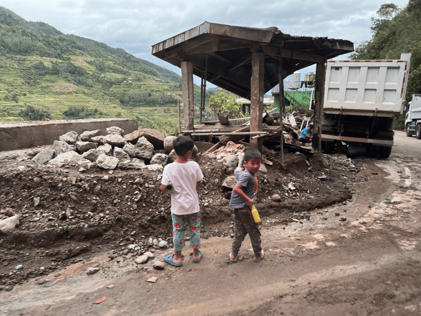 De rijstvelden hebben we van alle kanten gezien. Toen kwam Victor met een verzoek. Door de tyfoon was het veiliger om via een onder route naar Cauayan te rijden. Of we dat erg vonden. Hij had ook al even overlegt met zijn baas. Nee natuurlijk vinden we het niet erg. Veiligheid voorop. We hebben te maken met veel aardverschuivingen. Een grote hoeveelheid grond komt van de berghelling af. Er ligt veel puin op de weg. Het is een uitdaging om te rijden. Tevens zijn er veel vrachtwagens. Dus het schiet sowieso niet op. Zware trucks die bijna niet de helling op komen. Wegen die vaak maar 1 weghelft hebben. Kinderen en honden die op de weg spelen. We zijn blij dat we zelf niet rijden. Hoe meer we richting de eindbestemming komen hoe meer we zien wat de tyfoon heeft gedaan. We zitten hier niet in t hartje van de tyfoon. Gewaaid heeft t hier zeker. Huizen, bomen, verlichting veel is omgewaaid. Maar het dagelijks leven gaat gewoon door. Het is druk op de weg. Iedereen rijdt weer naar z’n bestemming. Het leven gaat weer door. Het is donker in Cauayan. Volgens Victor heeft het hotel wel een aggregaat. We krijgen een warm welkom samen met een komkommerdrankje. Komkommer met lemon is een veelvoorkomend drankje hier. De wifi doet het niet. Maar voor de rest werkt alles. We settelen ons. Later wordt er een brief onder de deur geschoven. Er wordt ons soep aangeboden om ons een comfortabel gevoel te geven tijdens deze tyfoon. Hoe gastvrij is dat. De soep is prima. Ik gooi er wat gedroogde uitjes in en lepel het naar binnen. Dat blijkt gedroogde knoflook te zijn. Veel doen ze hier met knoflook. Op de pinda’s. In de rijst en dus de soep. We besluiten om t hotel te blijven en daar een hapje te eten. Prima maaltijd. Het voelt wel een beetje ongemakkelijk. Er zijn zeker 10 mensen in de bediening. Er zit nog maar een handje vol mensen in het restaurant. Ze zijn zeer voorkomend en alles kan geregeld worden. Er is wel een hiërarchie. De een mag opnemen. De ander mag afhalen. En wij zijn net zo’n bijzonderheid als wij hen vinden. We zijn net reuzen hier.