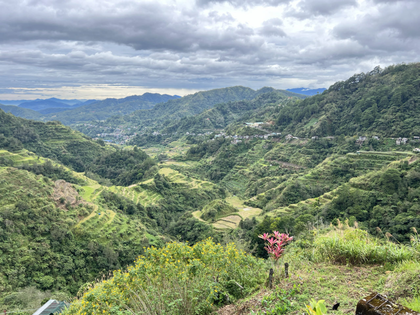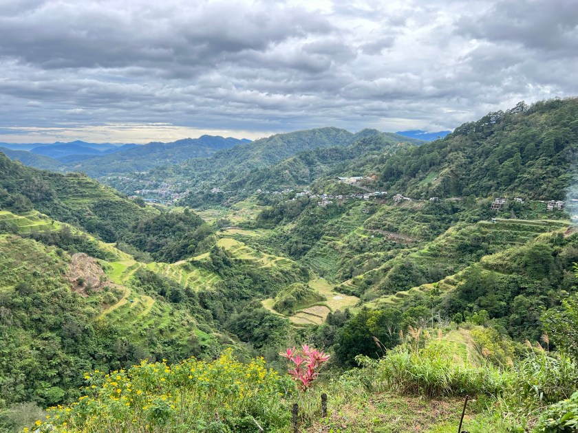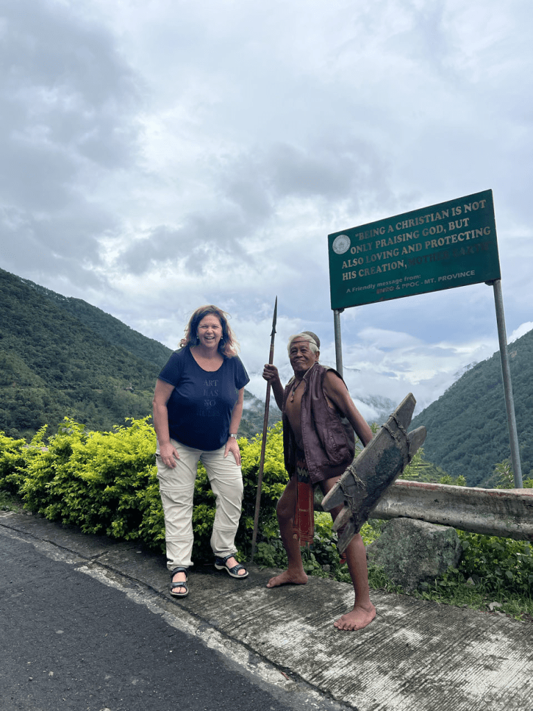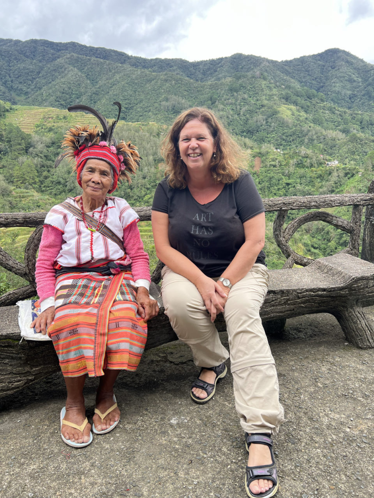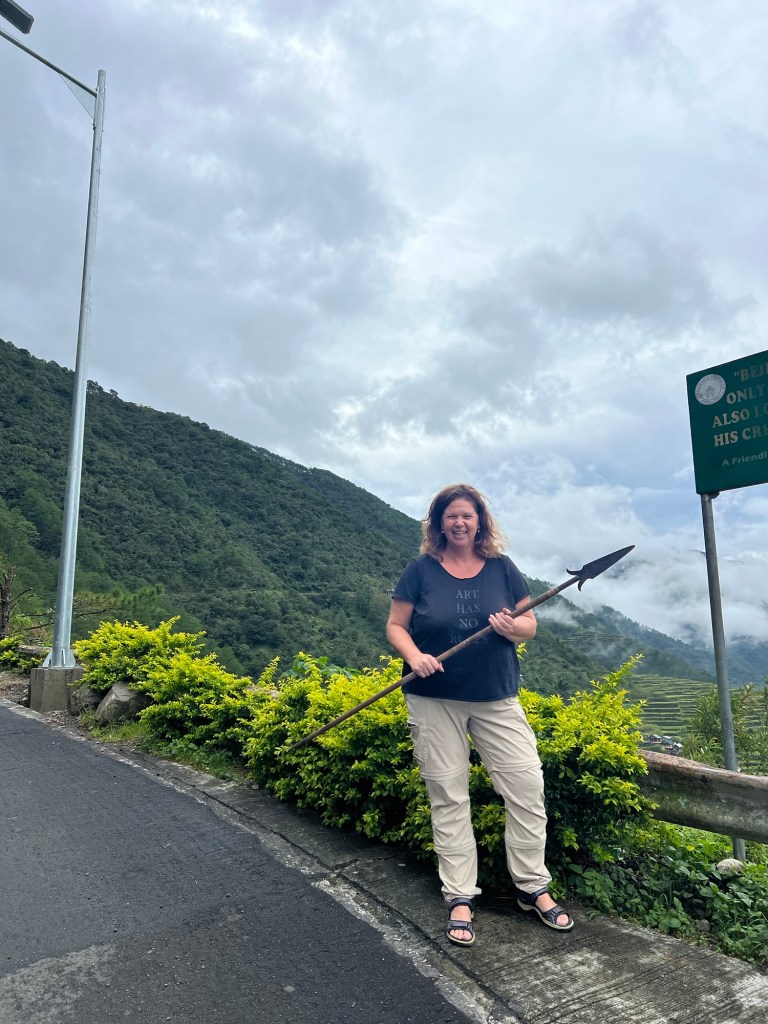 Wat een rare dag vandaag. Om 8 uur staat Victor op de stoep om ons naar de rijstvelden te brengen. De straten zijn nat. Het heeft volgens Rudy de hele nacht geregend. Ik heb niks gehoord. We rijden onder lichte regenval naar Banaue voor de rijstvelden. We zouden regelmatig stoppen. In t begin hebben we dat ook wel gedaan. Om 9.14 uur krijgen we weer een noodplan. Zo’n zelfde als in Taiwan. Nu geen aardbeving maar een tyfoon. Het is een beetje onwerkelijk. Victor blijft rustig. En het weer verandert ook niet zo 1, 2, 3. Dus ik denk tyfoon??? Ik zie veel kinderen op straat spelen en vraag aan Victor of die niet naar school moeten. Nee. Omdat die Tyfoon er is. Oww. We belanden bij een uitkijkpunt. In de verte zie je rijstvelden. Er is ook een oude meneer in traditionele kleren. Misschien kunnen we wel op de foto zegt Victor. Voor een klein prijsje. Dat doe ik maar. Je probeert zo hier en daar wat te ondersteunen. Ik mag zelfs de speer van meneer vasthouden 🤣. We rijden verder. Dan zijn we bij de rijstvelden Banaue en het is droog. Ik schiet wat plaatjes. Het is mooi hoor. Hier zit een mevrouw in traditionele kledij die ook graag op de foto wil. Huppakee. Ook maar even en dan is t voor vandaag genoeg. We komen er nl nog een paar tegen. Toen we geen belangstelling toonden kleedde ze zich vlug om en ging ze in haar paarse legging richting huis.