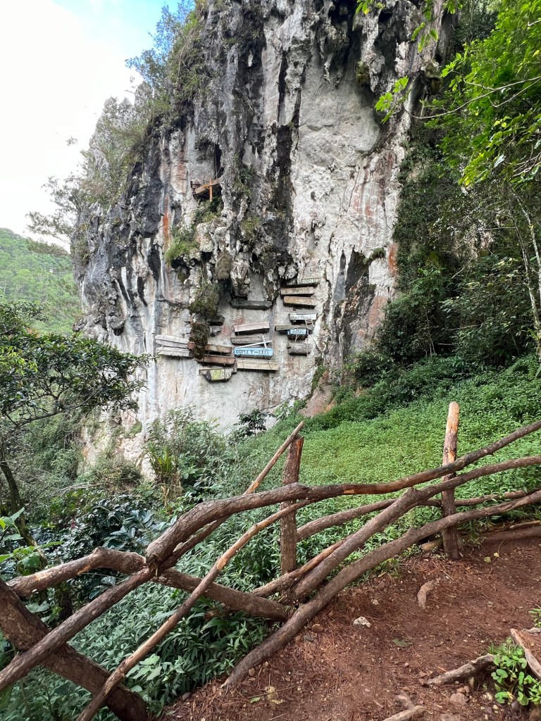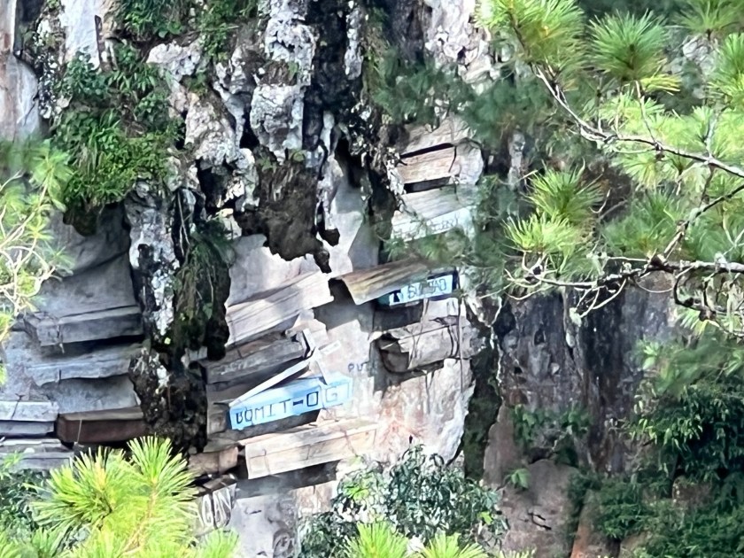 Let op. Hieronder een beetje luguber verhaal. De Igorot, de benaming voor een aantal bevolkingsgroepen dat hier woont, heeft deze traditie in t leven geroepen. Het wordt inmiddels al 2000 jaar gedaan. De doodskist wordt zelf gemaakt door het uithollen van een boomstam. Is de dierbare eenmaal overleden? Dan wordt deze vastgebonden met rotanbladeren en wijnstokken, bedekt met een deken en dan gerookt om te voorkomen dat het gaat rotten. Vervolgens wordt het lichaam in een foetushouding in een kist van een meter geplaatst. Als de overledene niet geheel in de korte doos paste, werden vroeger de botten gebroken om diegene er alsnog in te passen. Maar tegenwoordig maken ze de kisten net iets groter. Daarna brengen de inwoners de dierbare naar een grot of rots voor hun definitieve rustplaats. Hier druppelen de familieleden voor geluk de vloeistoffen van het ontbindende lichaam over zich heen, voordat de kist de rotswand wordt vastgenageld. Waarom begraven in de hoogte? De Igorot geloven dat hoe hoger je wordt begraven, hoe groter de kans is dat je in het hiernamaals komt en dus bij je voorouderlijke geesten terechtkomt. De Igorot begraven hun doden al meer dan tweeduizend jaar op deze wijze. Het gevolg: sommige lijkkisten hangen al meer dan een eeuw aan de steile rotswand. Het is een apart gezicht.