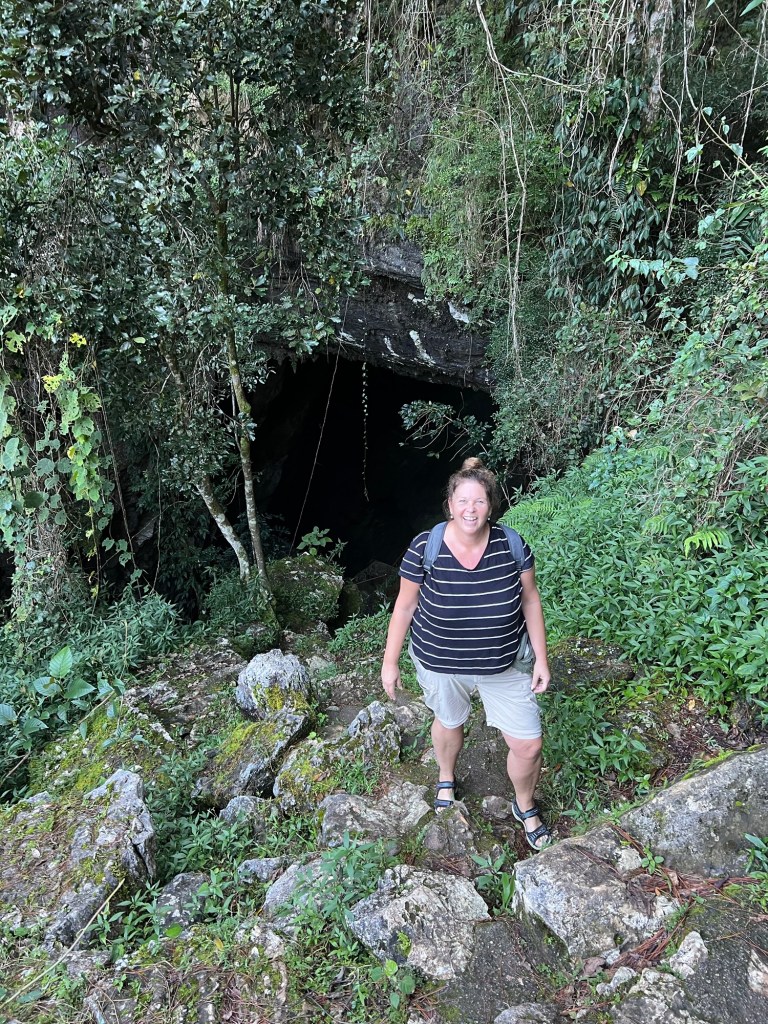 De gids verteld dat ze de overledenen die eenmaal zijn “begraven” met rust laten. Je mag de kist niet meer aanraken. Ze zijn bezig met hun laatste reis in een natuurlijke omgeving. We beginnen weer aan de klim naar boven. Ondertussen lopen we tussen de koffiestruiken. Het is erg vredig hier. Mijn gehijg maakt t wat minder vredig. We rijden een stukje verder en daar bezoeken we een grot. Er liggen heel veel kisten ingeklemd in een gat in de rots. Ik glibber weer omhoog. Dan gaan we naar de beroemdste grot. Sumaging. Het is redelijk begaanbaar. Ik hou me stevig aan de reling vast. De kisten zie je niet zonder zaklamp. De kisten lagen vroeger dichter bij de ingang maar de toeristen zaten er aan. Toen hebben ze een ceremonie gehouden en ze verbrand.